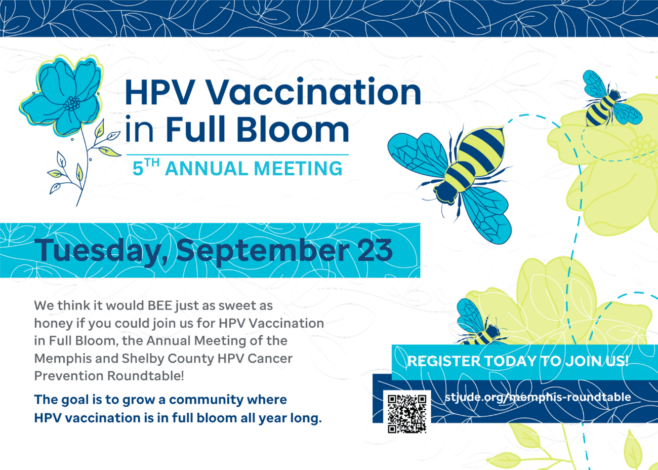 Registration for the 5th Annual Meeting of the Memphis and Shelby County HPV Cancer Prevention Roundtable is open! Continuing the theme HPV Vaccination in Full Bloom, the annual meeting will bring together health care professionals, public health leaders, and community advocates to reflect on our progress and cultivate new strategies for HPV cancer prevention across Memphis and Shelby County.