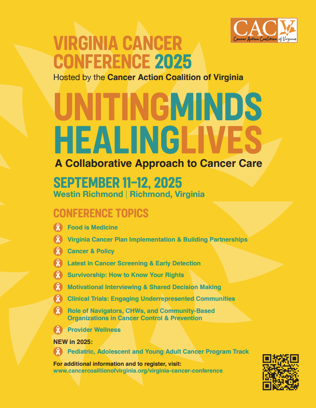 The Cancer Action Coalition of Virginia (CACV) is excited to host the 2025 Virginia Cancer Conference (VCC25): Uniting Minds, Healing Lives. The conference will be held at Westin Richmond on September 11-12, 2025. The conference will provide education and training to key stakeholders in the Virginia cancer community. The conference will feature keynote presentations, breakout sessions, question and answer periods, exhibits, and networking opportunities. CACV is excited to offer a new program track this year focused on pediatric and adolescent and young adult cancer. The following continuing education credits are being offered through VCU Health Continuing Medical Education: 8 AMA credits, 8 ASWB credits, and 8 ANCC credits. Check out the VCC25 E-Brochure for a full look at the agenda, speakers, registration, and more. Questions about the meeting? Contact info@cancercoalitionofvirginia.org.