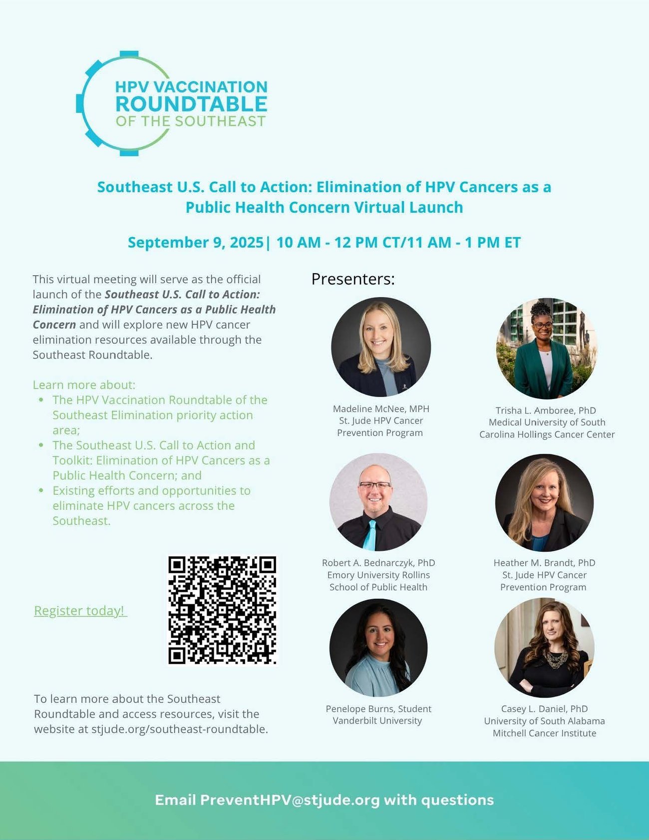with, and for childhood cancer survivors and their families to have the information and confidence to choose HPV vaccination. Keeping everyone HPV cancer free is the overarching goal of the forthcoming Southeast United States (U.S.) Call to Action: Elimination of HPV Cancers Starting with Cervical Cancer as a Public Health Concern. On September 9, the HPV Vaccination Roundtable of the Southeast will launch the first U.S. regional plan to eliminate HPV cancers, starting with cervical cancer as a public health concern, across the Southeast region. Read more about the plan later in this newsletter and in this special communication. Register for the virtual seminar releasing the plan here. Together, we can eliminate HPV cancers in the Southeast. We continue to provide updated on the current vaccination landscape. Notably, the next meeting of the Advisory Committee on Immunization Practices (ACIP) is scheduled for September 18-19, 2025. HPV vaccination is not listed as a topic for discussion, but the agenda is subject to change. As always, there are many more updates and opportunities shared in this month’s Path to Prevention newsletter. If you have information to share, please email us at PreventHPV@stjude.org.
