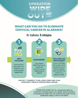 the New Toolkit As the HPV Vaccination Roundtable of the Southeast prepares to release the first ever regional plan to eliminate HPV cancers beginning with cervical cancer as a public health concern, Alabama’s Operation Wipe Out brings new materials to continue implementation of the first ever plan in the U.S. Operation Wipe Out is a bold initiative designed to eliminate cervical cancer by increasing HPV vaccination, improving cervical cancer screening rates, and ensuring access to timely follow-up and treatment. The new Operation Wipe Out Toolkit allows users to access practical guides and resources needed to bring this life-saving mission to their community.