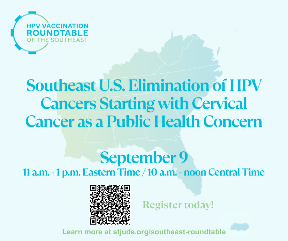 The HPV Vaccination Roundtable of the Southeast includes people and partners from 12 states and two jurisdictions across the Southeastern United States with the goal of improving HPV vaccination coverage to protect against HPV cancers. The Southeast Roundtable is guided by leadership from the Executive Committee, Steering Committee, implementation teams, and general membership. Visit the HPV Vaccination Roundtable of the Southeast website at stjude.org/southeast-roundtable. Read the latest Southeast Roundtable quarterly communication from July here.