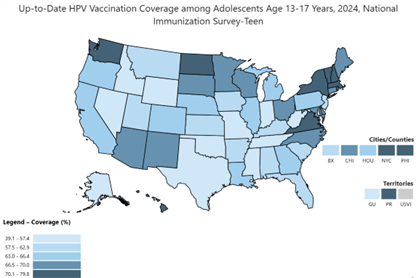 Access Vaccination Coverage Among Adolescents Aged 13–17 Years — National Immunization Survey-Teen, United States, 2024 by Pingali et al. here. Access 2022 HPV cancer data through the U.S. Cancer Statistics here.