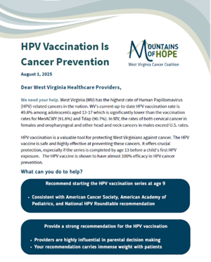 As part of their back-to-school efforts, Mountains of Hope West Virginia Cancer Coalition will be sending a letter to primary care physicians across West Virginia, educating them about and encouraging the implementation of initiating HPV vaccination at age nine and providing a strong recommendation for the HPV vaccination. The letter highlights HPV vaccination as a safe and effective tool for cancer prevention and underscores the vital role of providers in making strong recommendations to families. We were excited to be a partner in this important