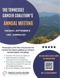 The Tennessee Cancer Coalition will host its Annual Statewide Meeting virtually on September 9 from 1-3 p.m. Central Time. This meeting will focus on key cancer-related topics designed to support and inform cancer control efforts in the state. Speakers include Martin