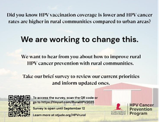 We invite guest contributors to share information on how they are working to improve HPV vaccination in rural areas. If you are interested in contributing or learning more about our efforts to improve HPV vaccination with rural communities, please email us at PreventHPV@stjude.org.